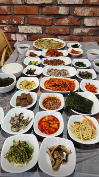 무려 10가지 이상의 밑반찬과 국, 메인 요리가 제공됩니다