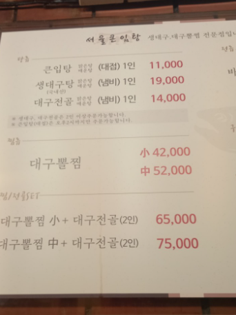 생대구탕 정문점인 서울큰입탕의 메뉴는