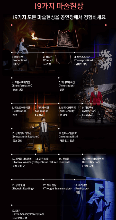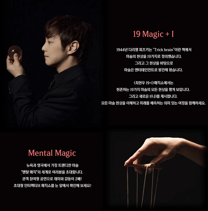최현우 마술쇼 19+I에서는 현존하는 19가지 마술의 모든 현상을 펼쳐 보입니다