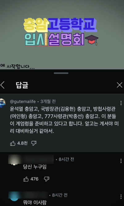 충암고 입시설명회 youtube 영상 속 댓글 계엄령 예고?