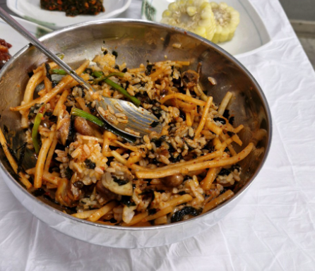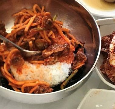 제공된 꼬막 비빔밥을 밥위에 얹어 그대로 비벼 먹습니다